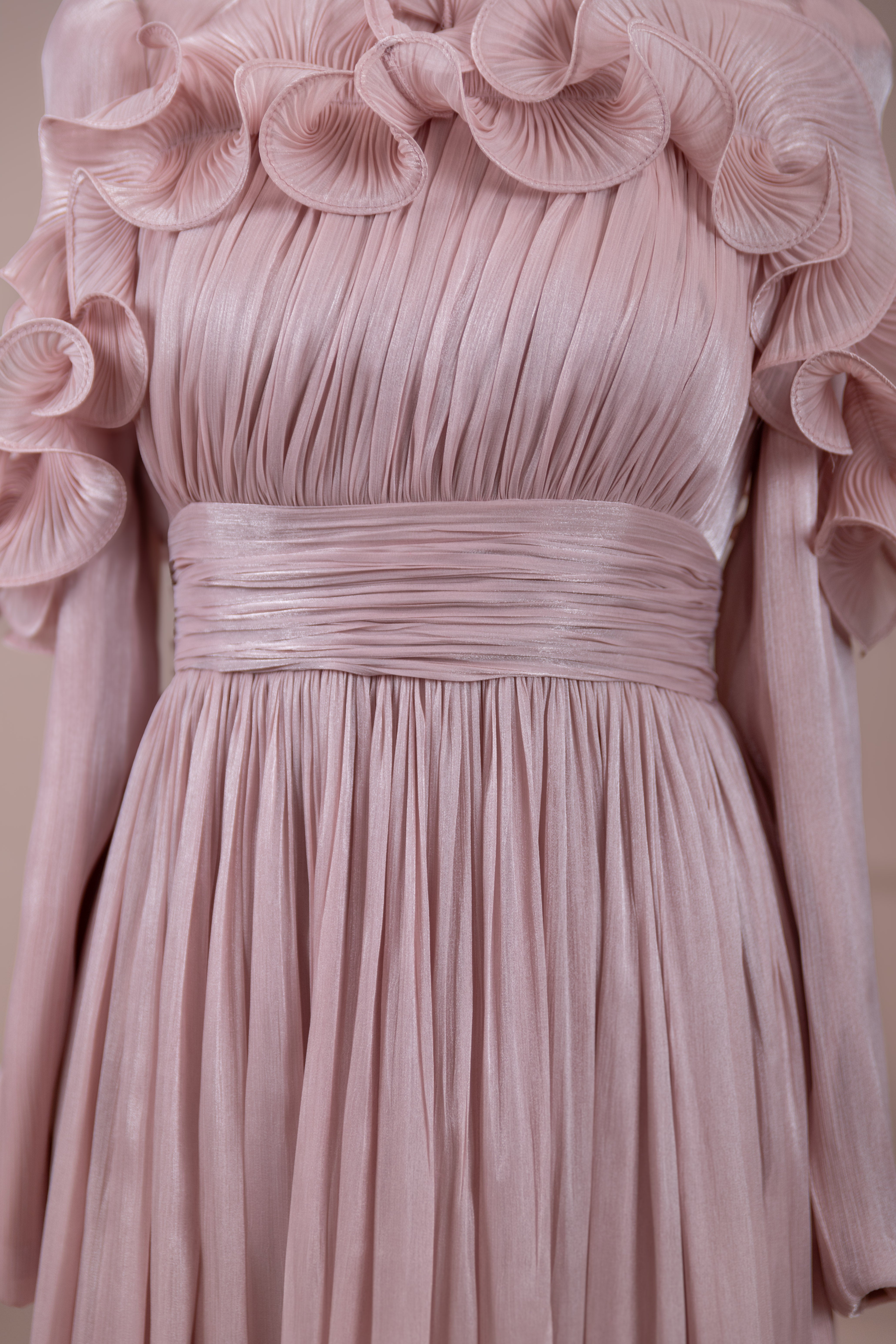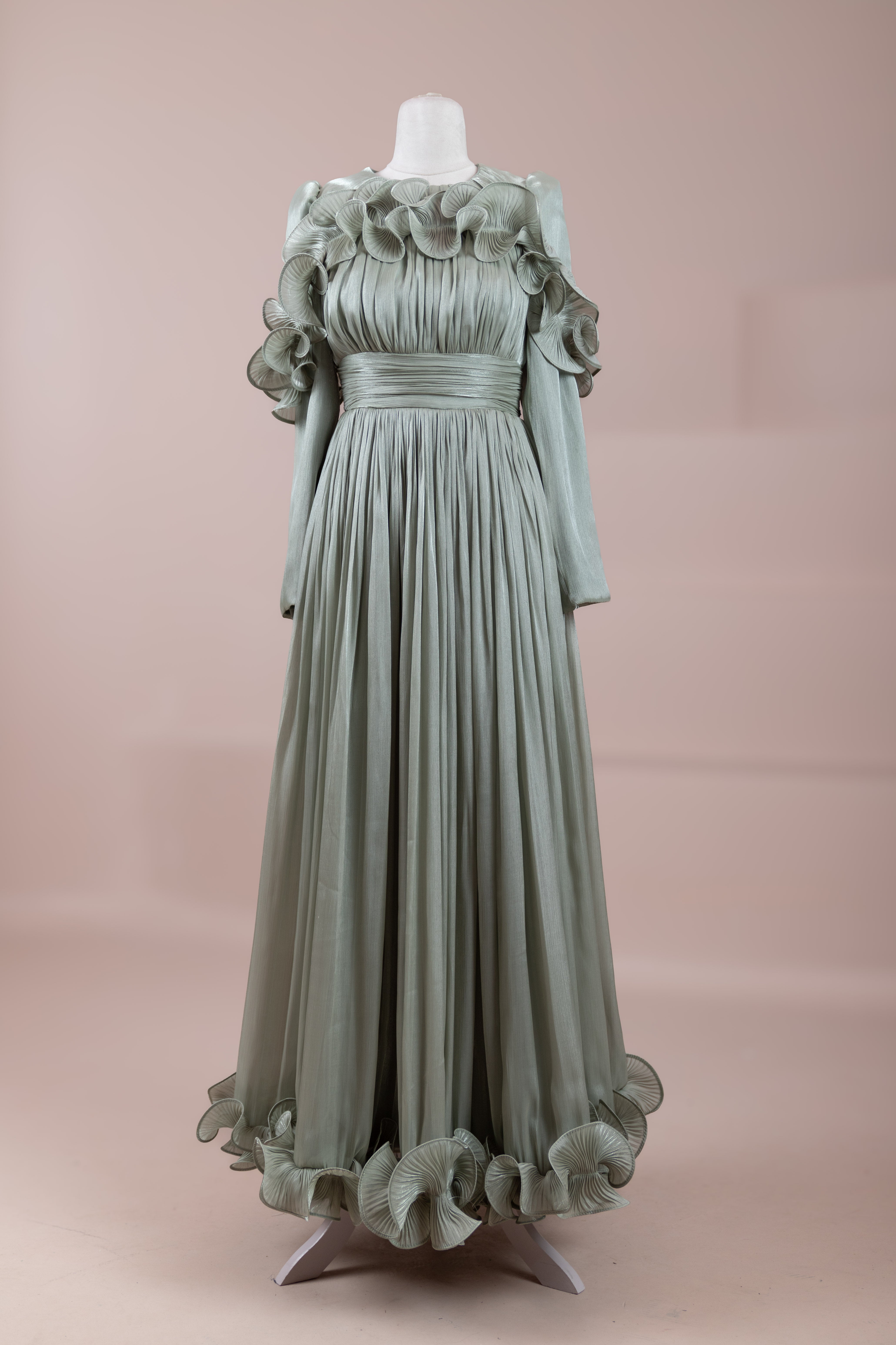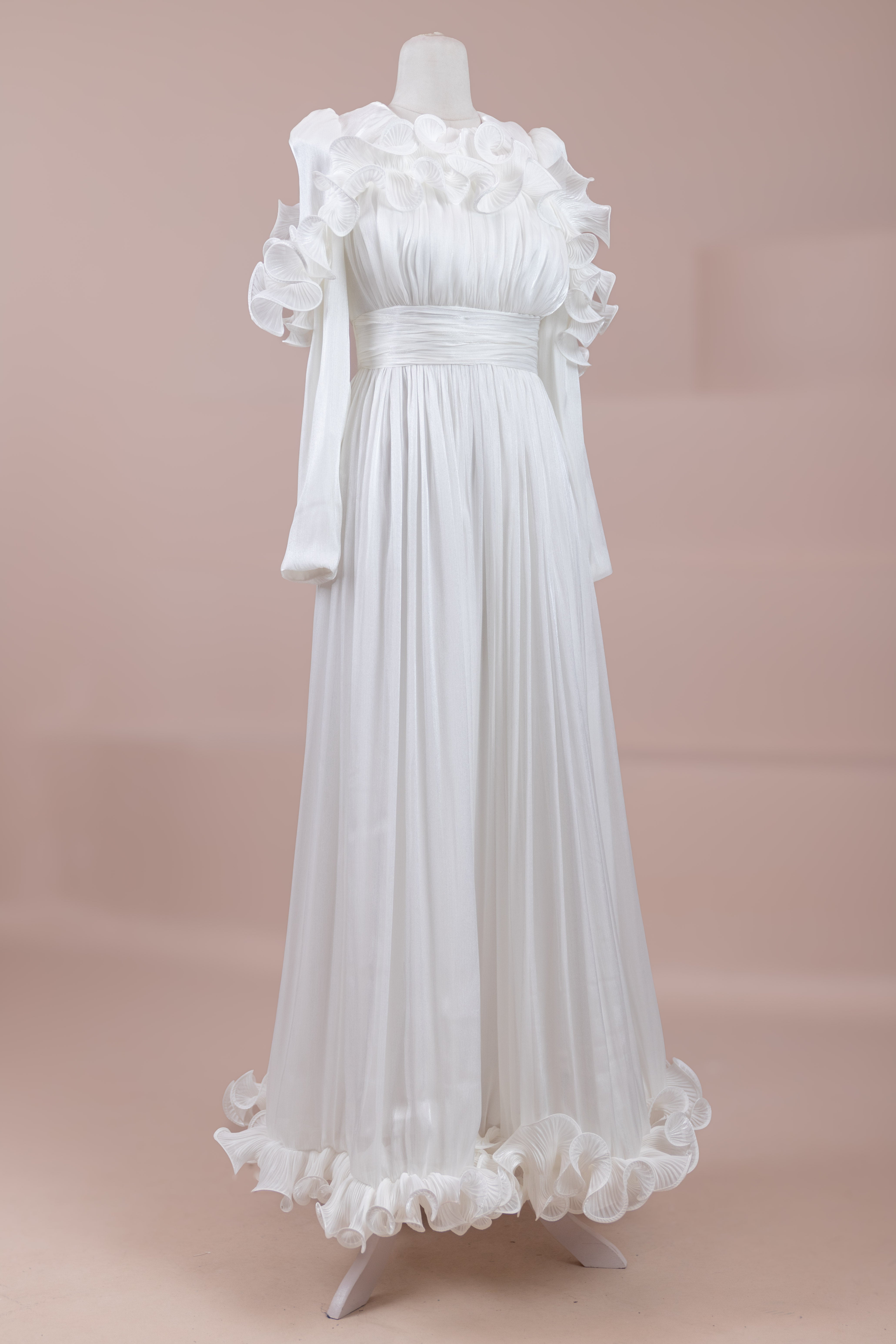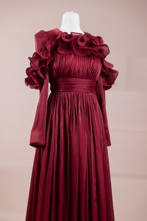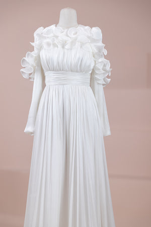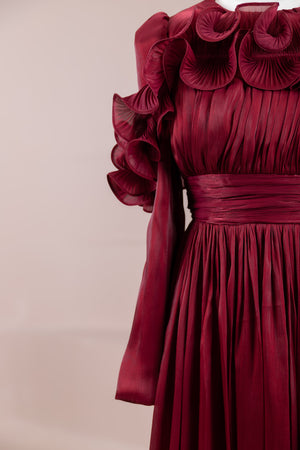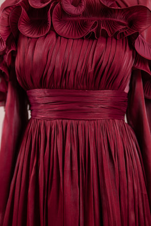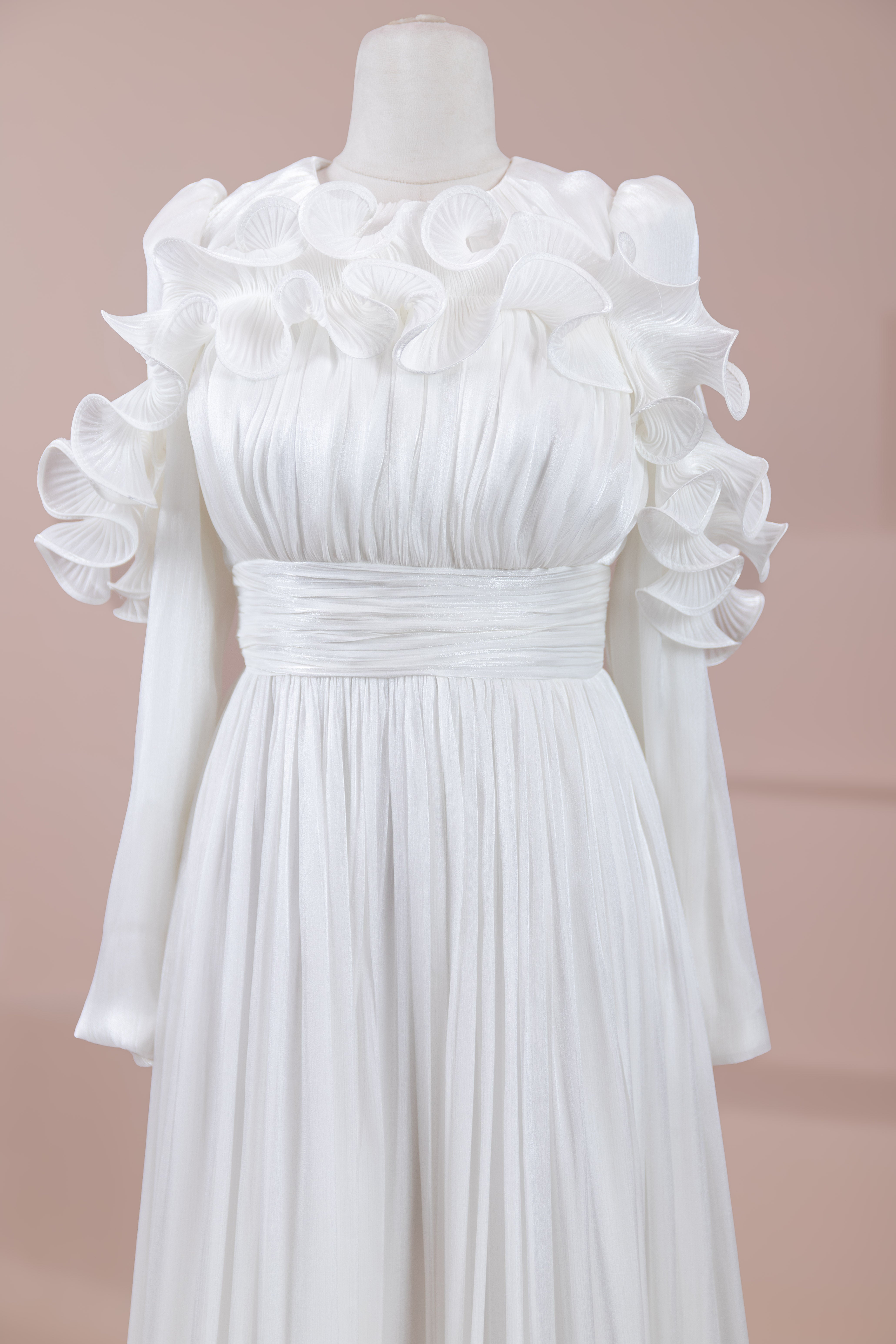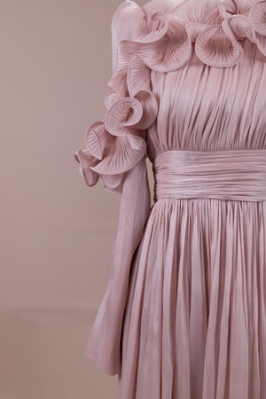 This design, highlighted by its romantic and voluminous details, creates an elegant silhouette thanks to its high waist cut. The upper body features fine pleating, while the belt form at the waist ensures a balanced fit on the body. Ruffle details on the shoulders and skirt edges add a three-dimensional and couture character to the design. The long and flowing skirt form presents a strong stance with movement.