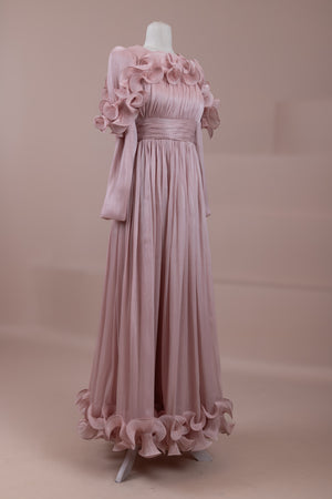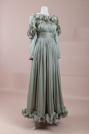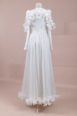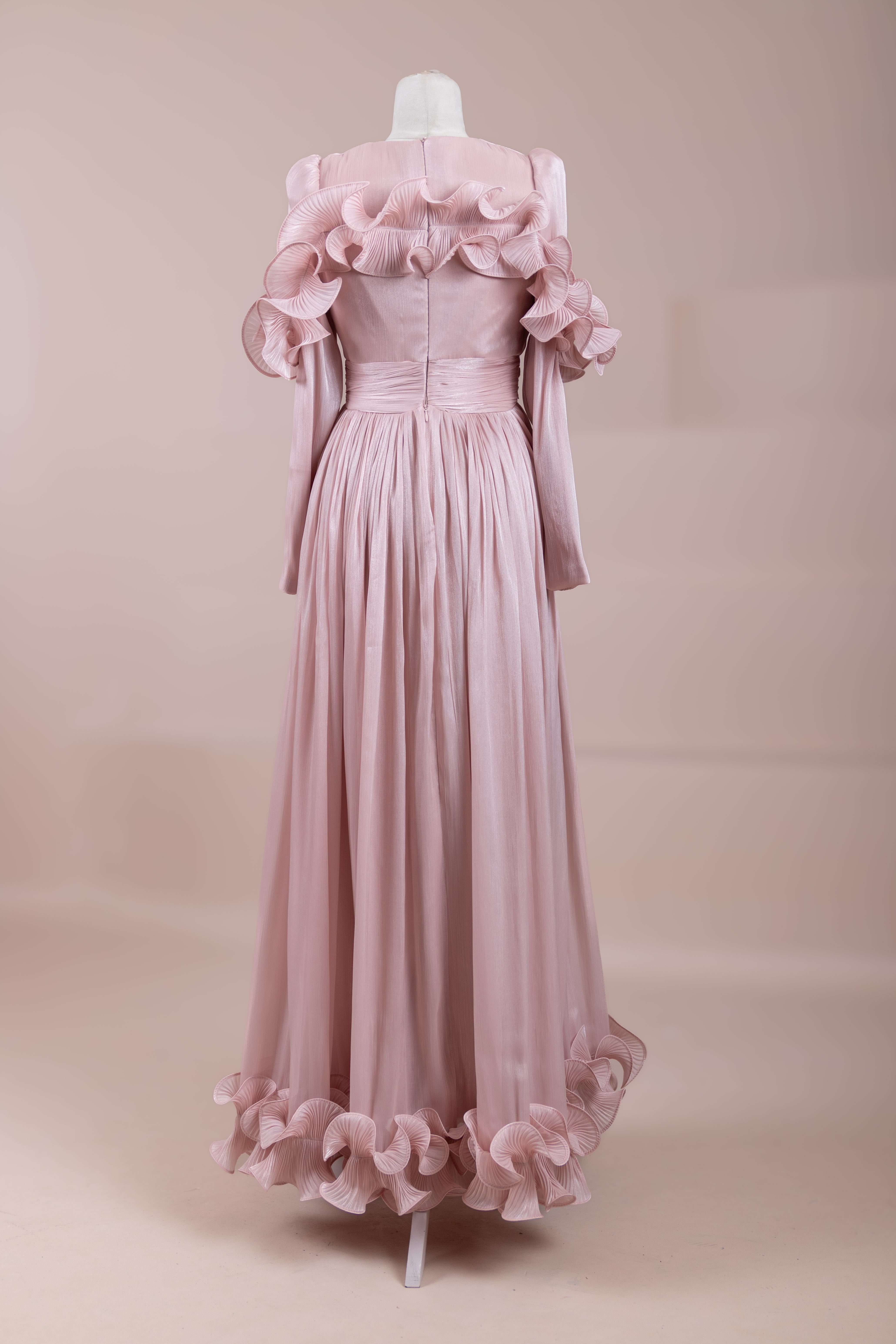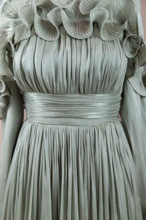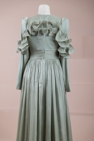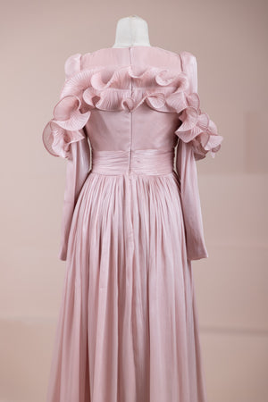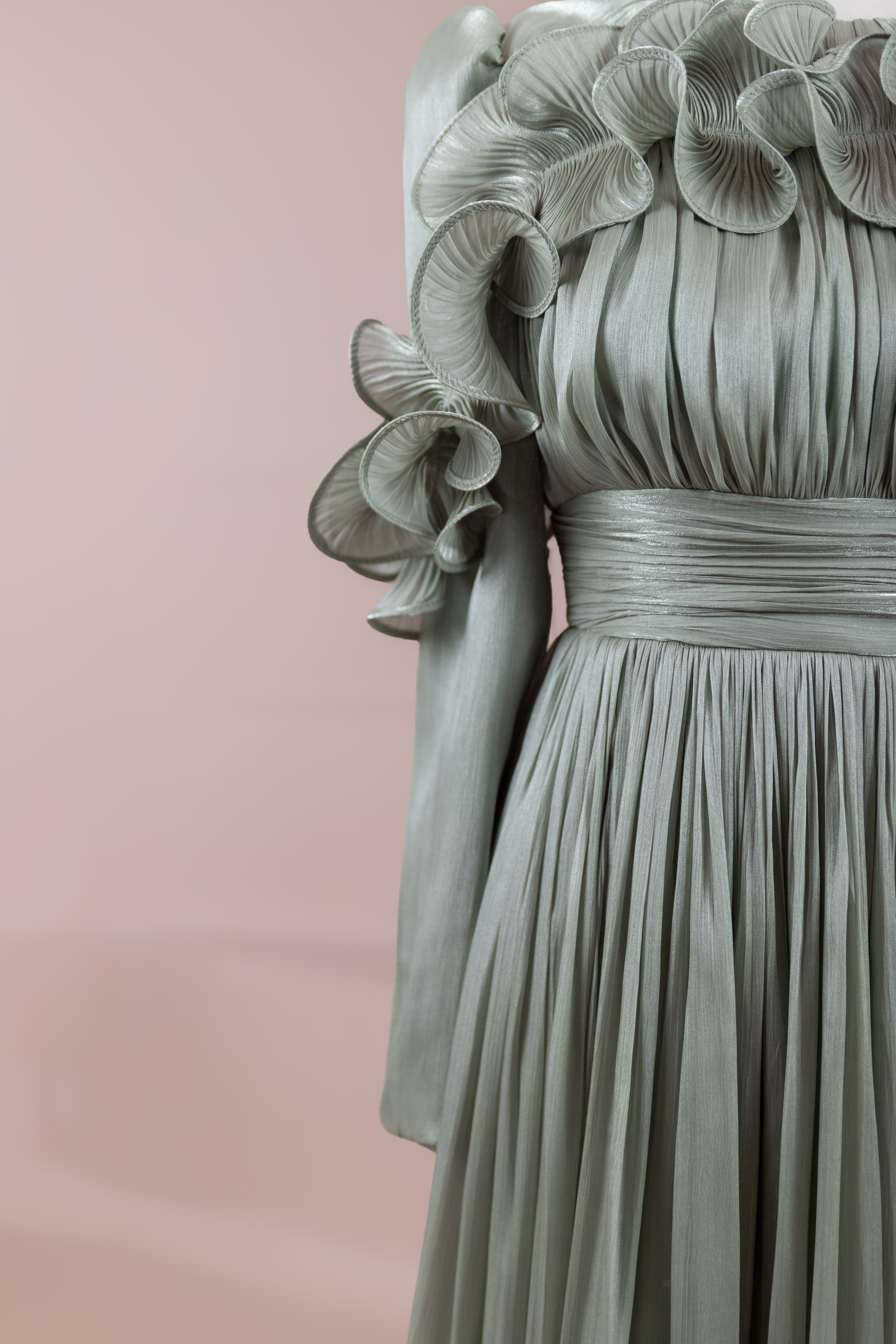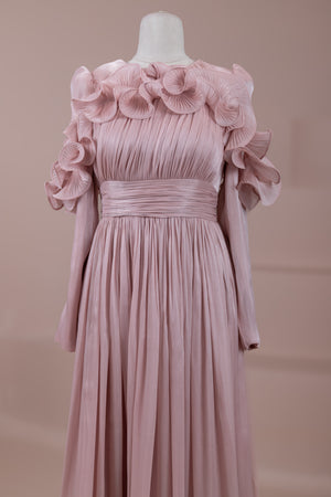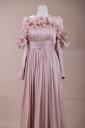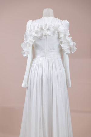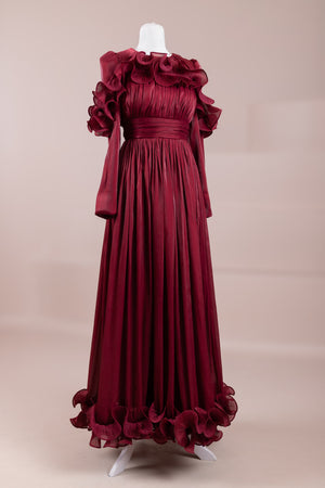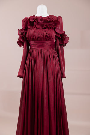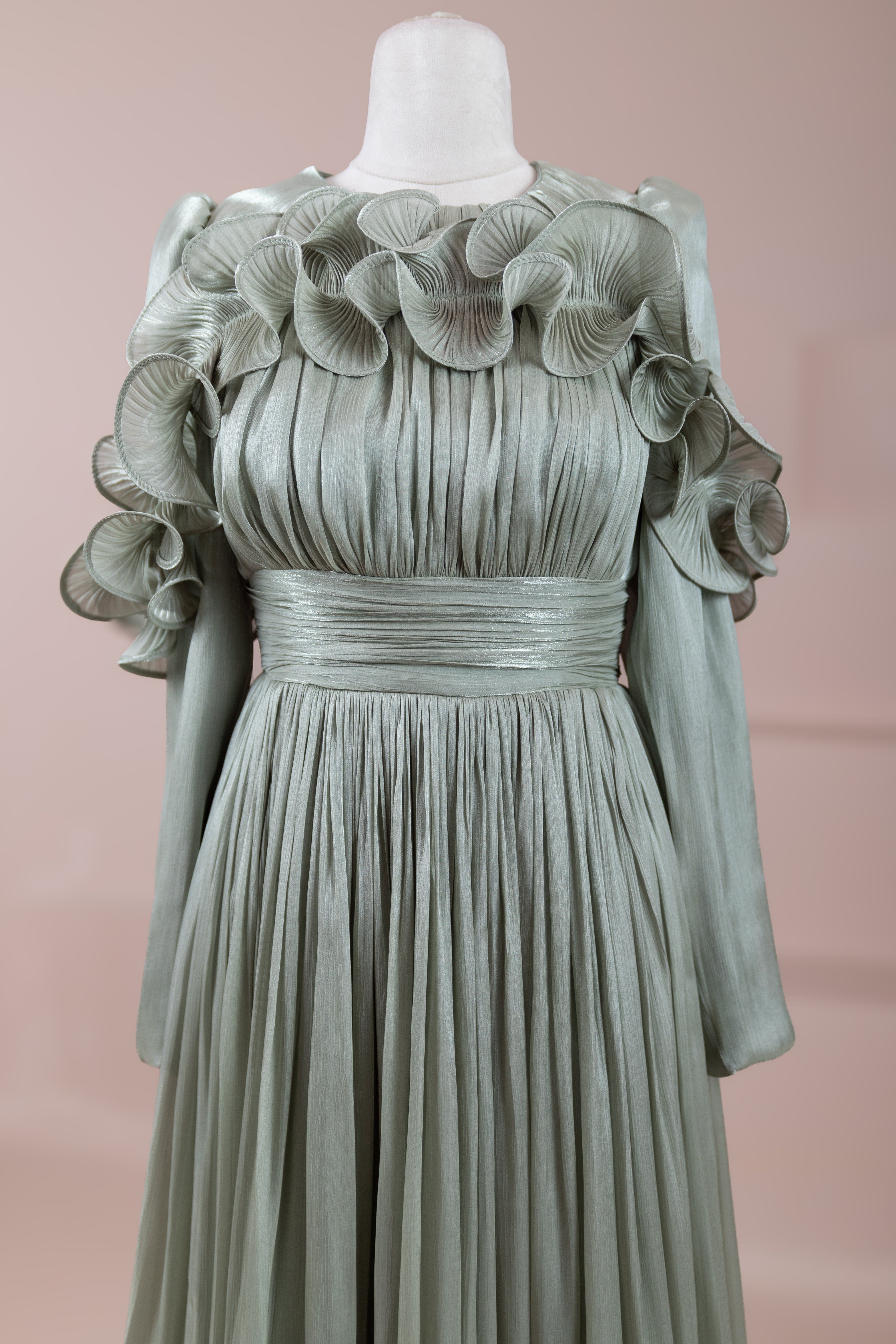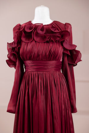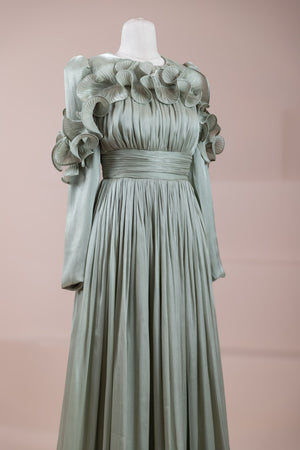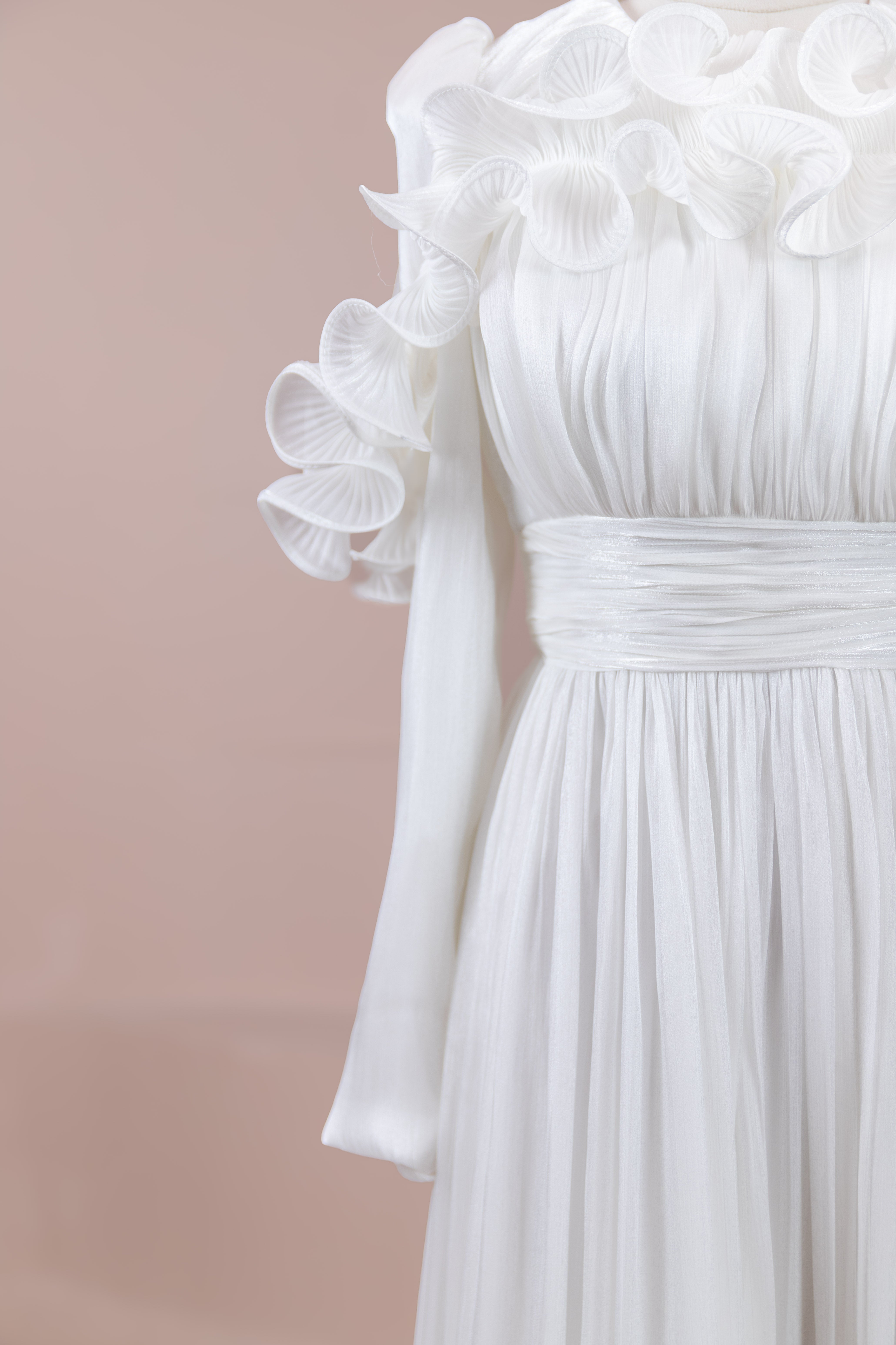 This design, highlighted by its romantic and voluminous details, creates an elegant silhouette thanks to its high waist cut. The upper body features fine pleating, while the belt form at the waist ensures a balanced fit on the body. Ruffle details on the shoulders and skirt edges add a three-dimensional and couture character to the design. The long and flowing skirt form presents a strong stance with movement.