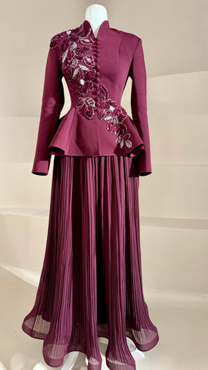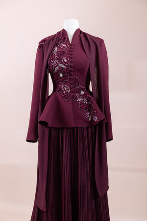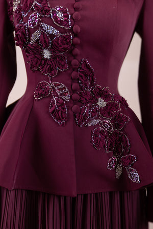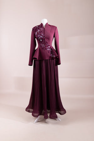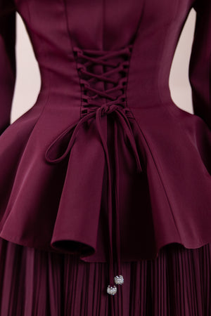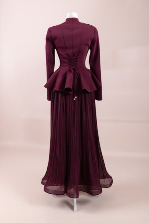 The upper part is in a peplum jacket style, fitted at the waist with a slightly flared lower section.