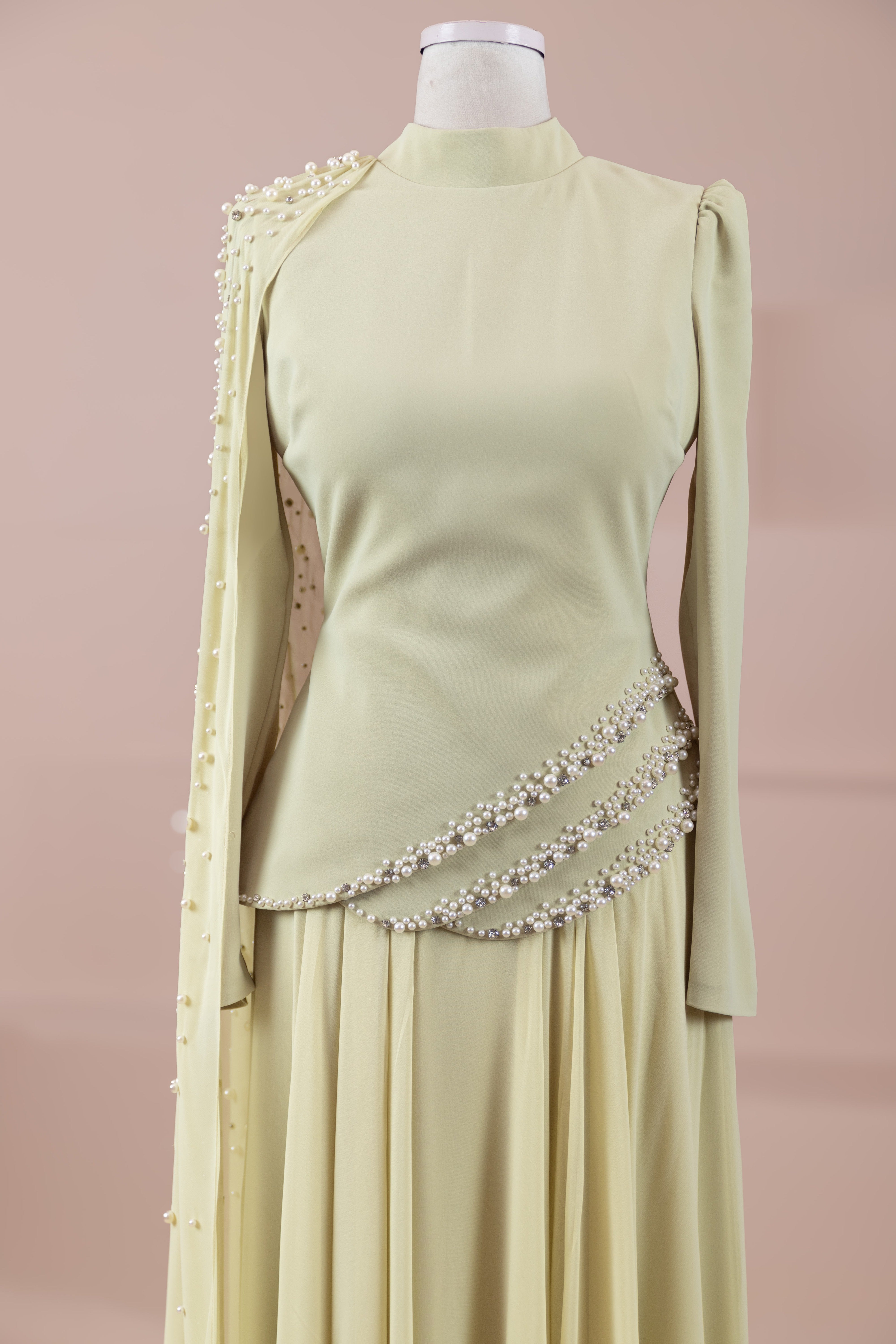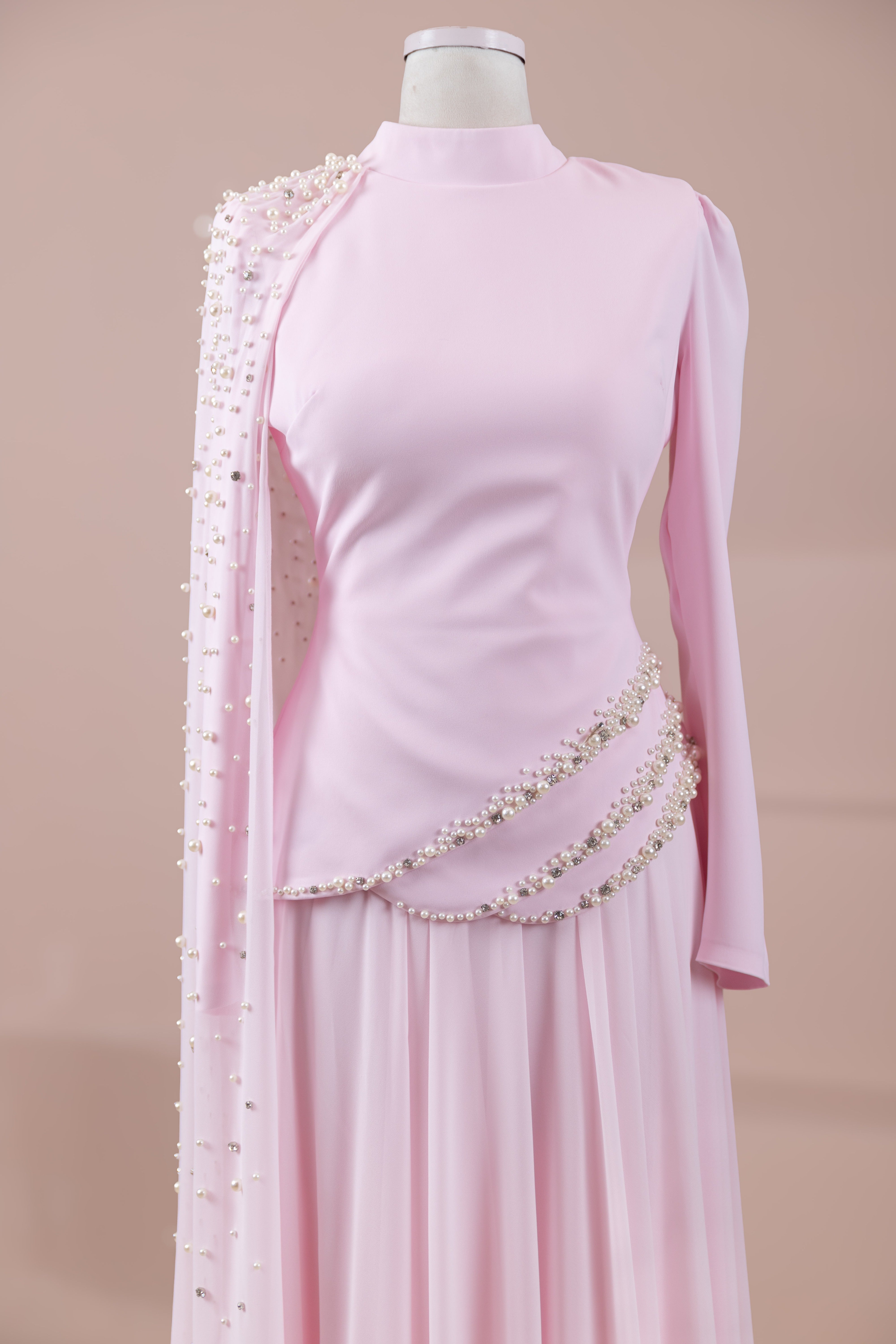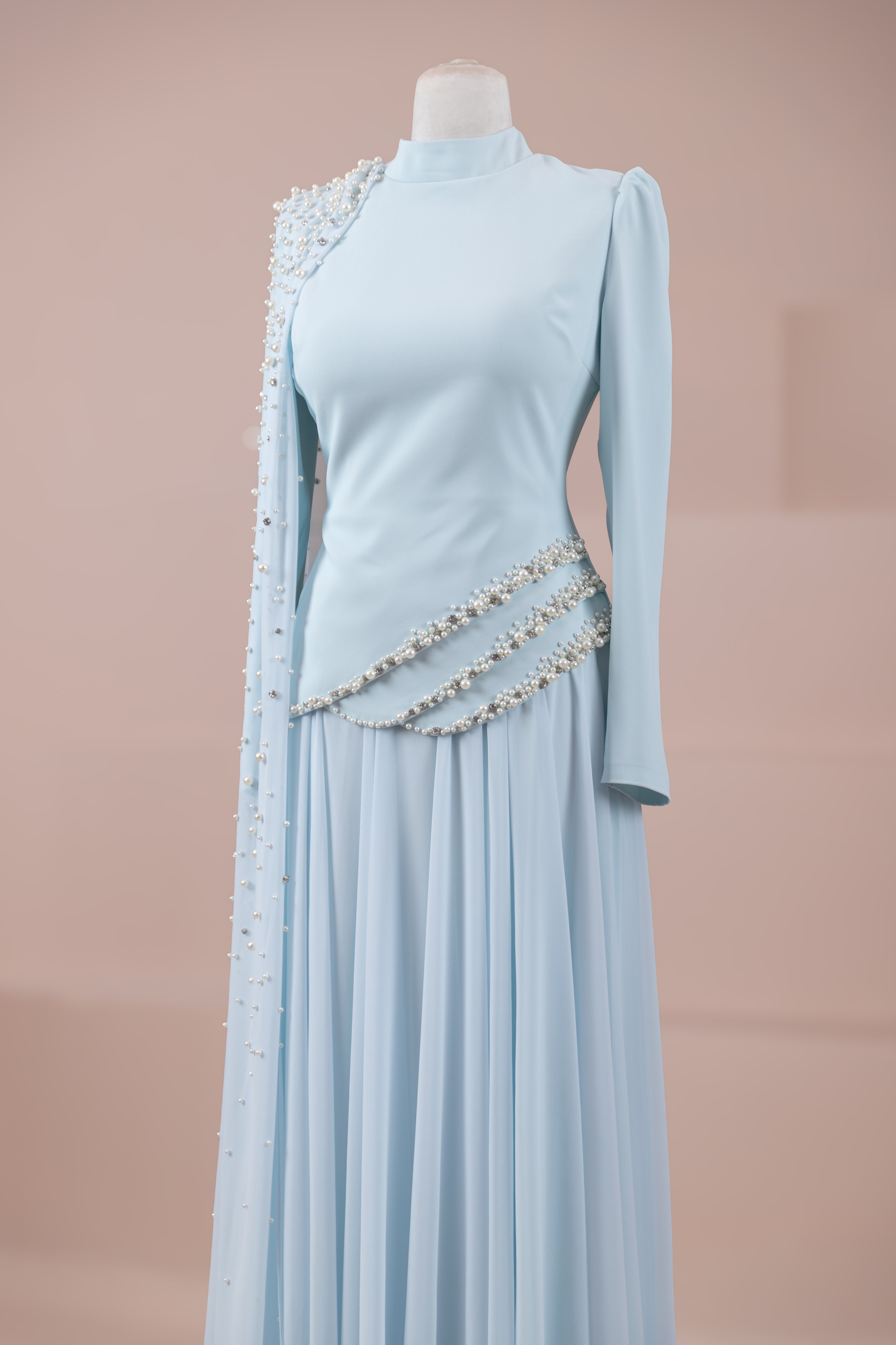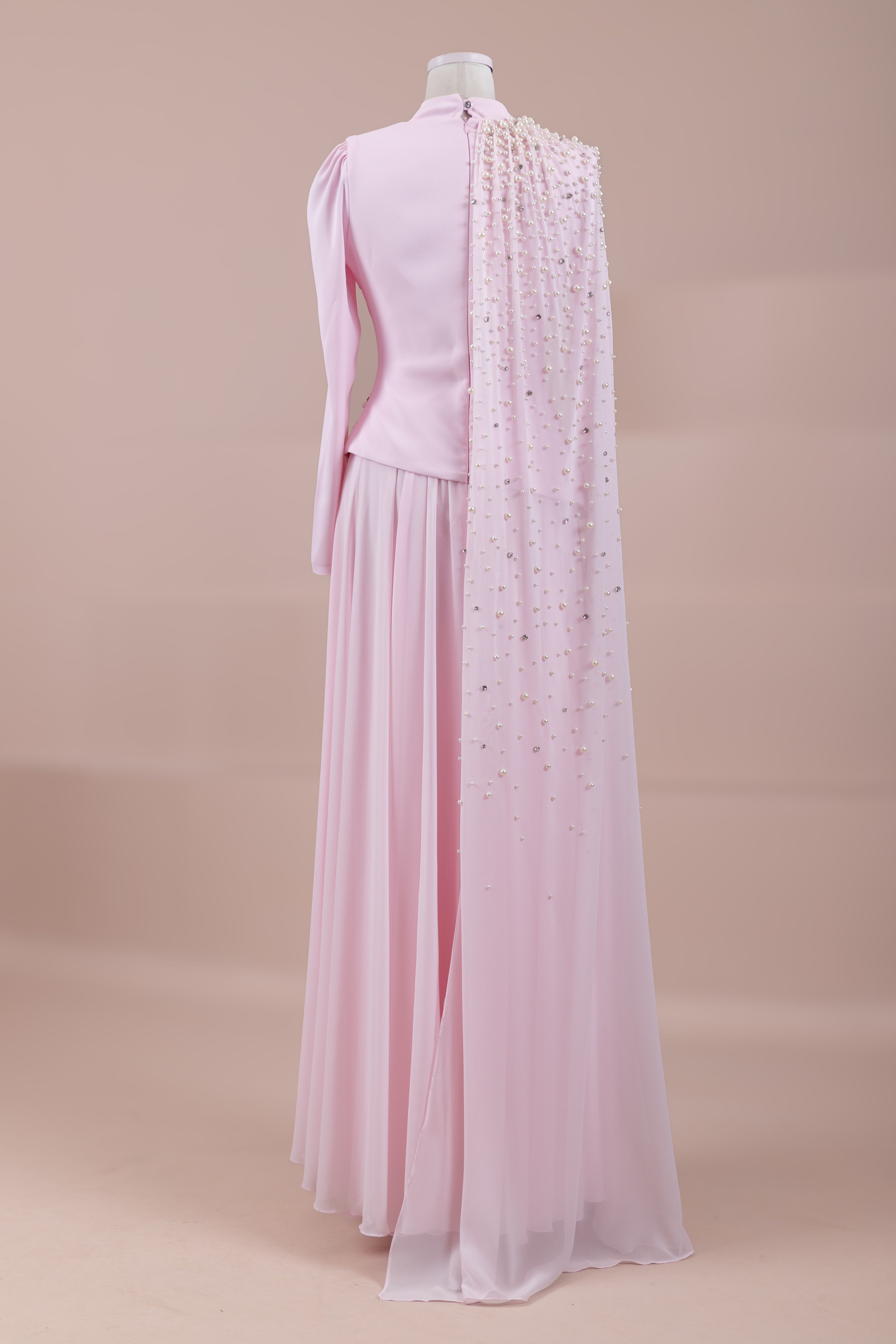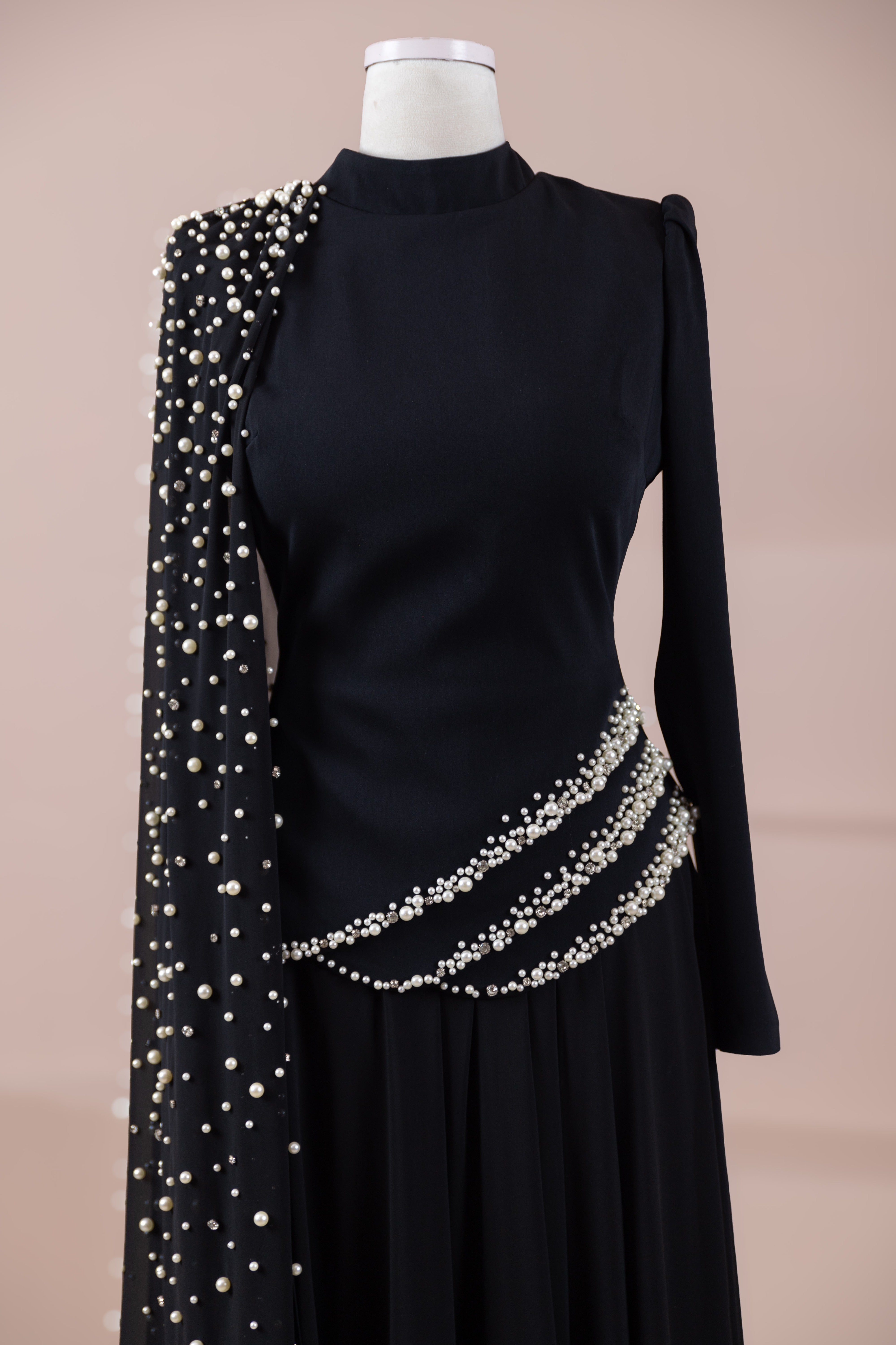 – Decoration with stone and pearl-like embellishments on the one shoulder