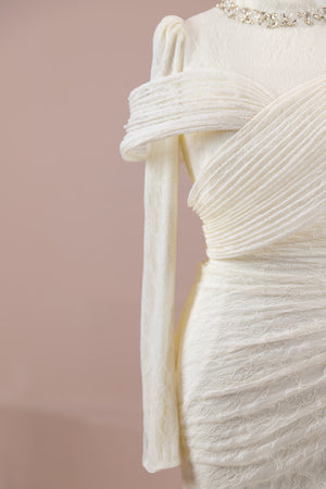 Asymmetric shoulder, draped upper design