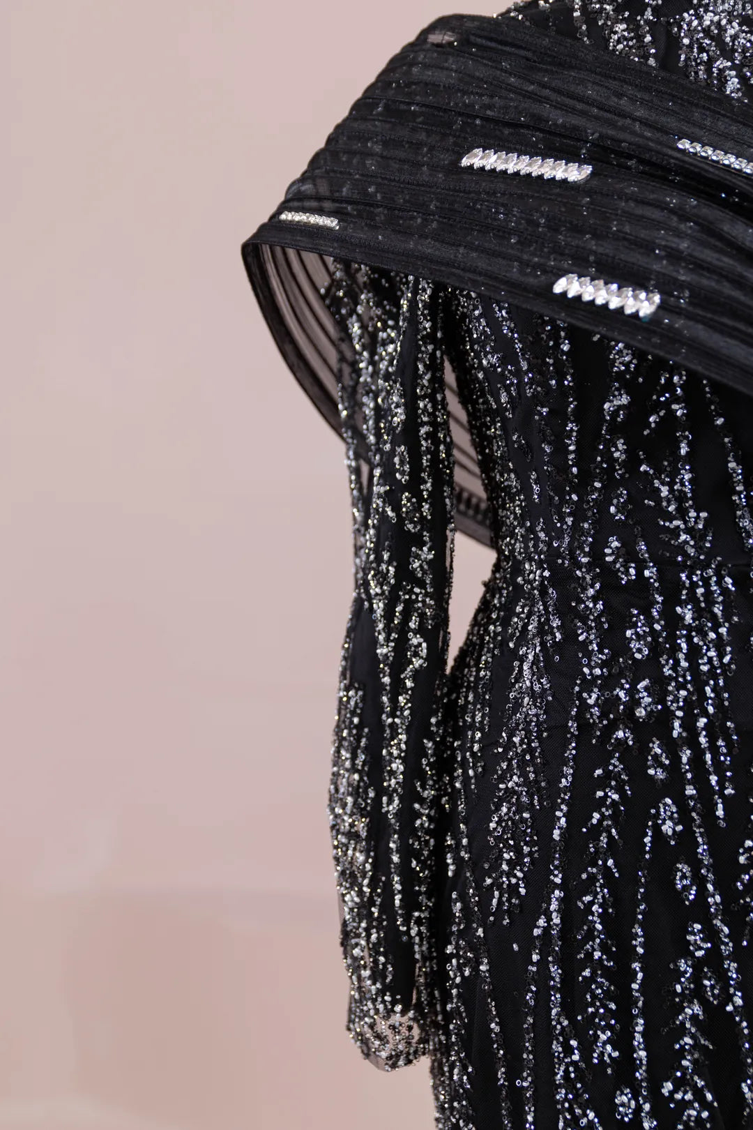 - Cut: Mermaid, one-shoulder draped design. High collar; modern elegant look