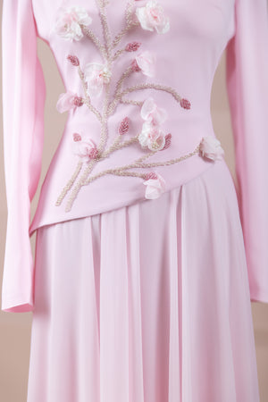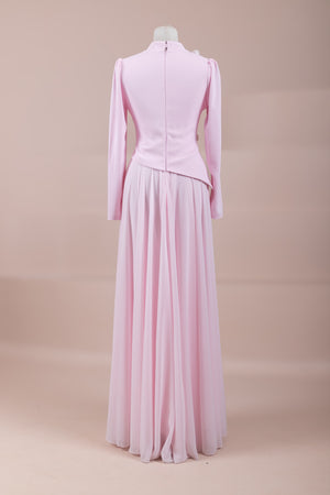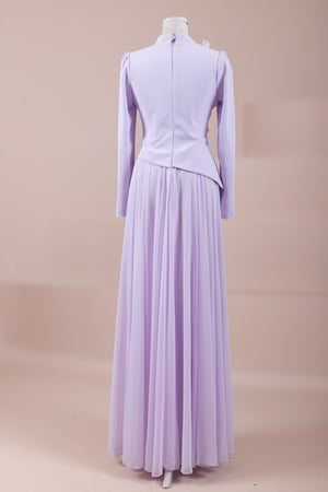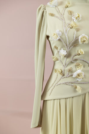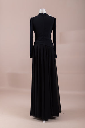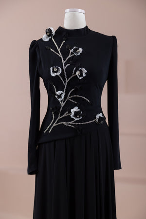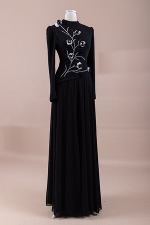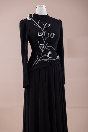 The upper body has a slim fit cut that fits the body. The waistline is designed with a slightly asymmetrical form, and the lower part flows from the waist down with an A-line skirt structure. The maxi length offers an elegant and balanced silhouette. The shoulders have a slightly structured form.